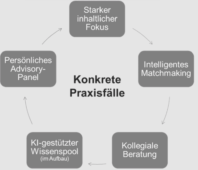 Durch ein intelligentes Matchmaking werden CxOs mit ähnlichen Interessen und Kompetenzen zu relevanten Praxisfällen zusammengeführt. Aufbau und Betrieb notwendiger Plattformen und Services übernimmt eine Partnergesellschaft. In moderierten Sessions von jeweils zwei Stunden wird der Fall eines Mitglieds im Detail beleuchtet, praxisnah und methodisch stringent. Wesentliche Erkenntnisse fließen in einen KI-gestützten Wissenspool, der als wertvolle Kontakt- und Fallbibliothek allen Werkstatt-Mitgliedern exklusiv zur Verfügung steht.